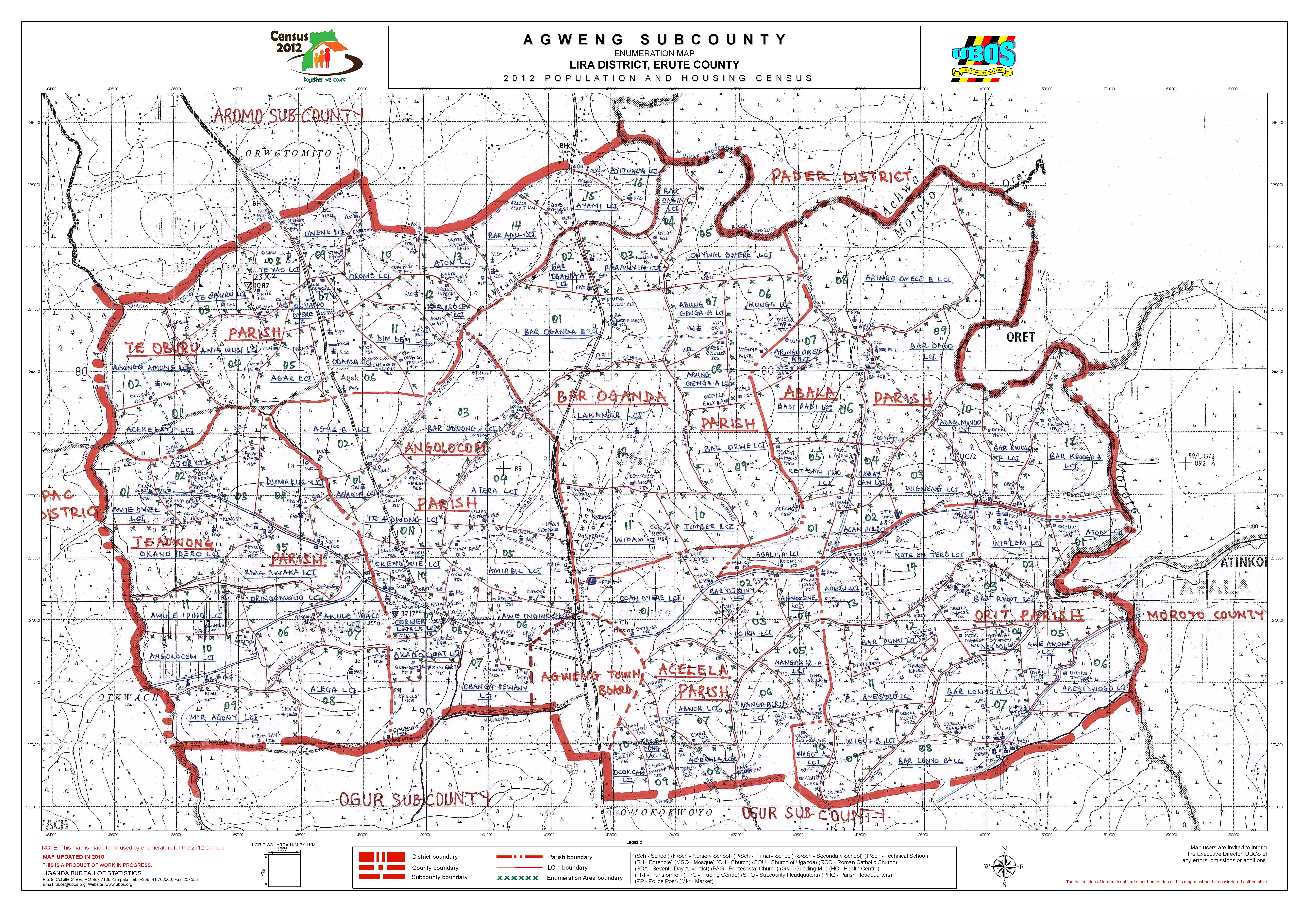 Administratively, Agweng Sub County is divided into seven parishes and has a total of 86 Villages.